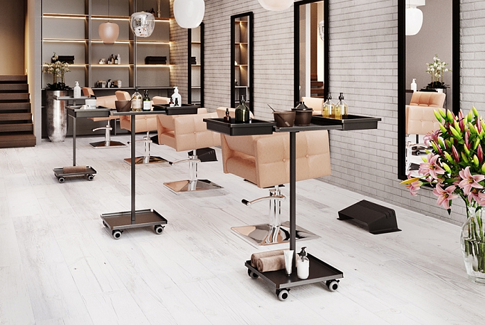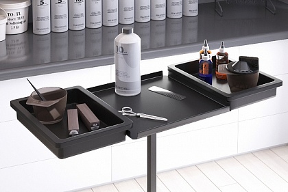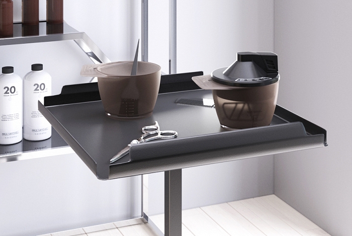 Уникальной особенностью столика являются специальные бортики, которые препятствуют падению размещенных на нем аксессуаров и позволяют разместить на нем стандартные лотки от парикмахерских тележек, тем самым расширяя полезное пространство стола в случае необходимости.